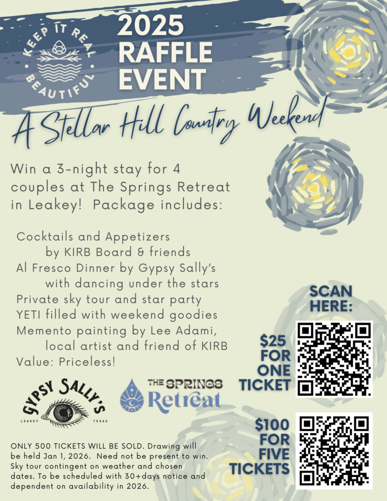 KIRB invites you to support our missions by purchasing a raffle ticket from our 2025 Fall Fundraiser. KIRB has launched our 2025 Fundraising Raffle Event “A Stellar Hill Country Weekend” KIRB manages the recycling program in Real County, coordinates river and highway clean ups, and promotes dark skies, and we can’t do it without your support. Ticket proceeds support KIRB’s missions.
